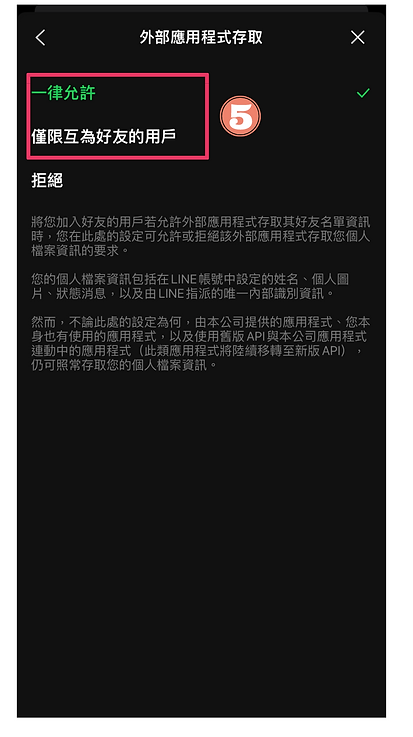 (步驟: LINE主頁右上角設定>隱私設定>外部應用程式存取>僅限互為好友用戶 或 一律允許)